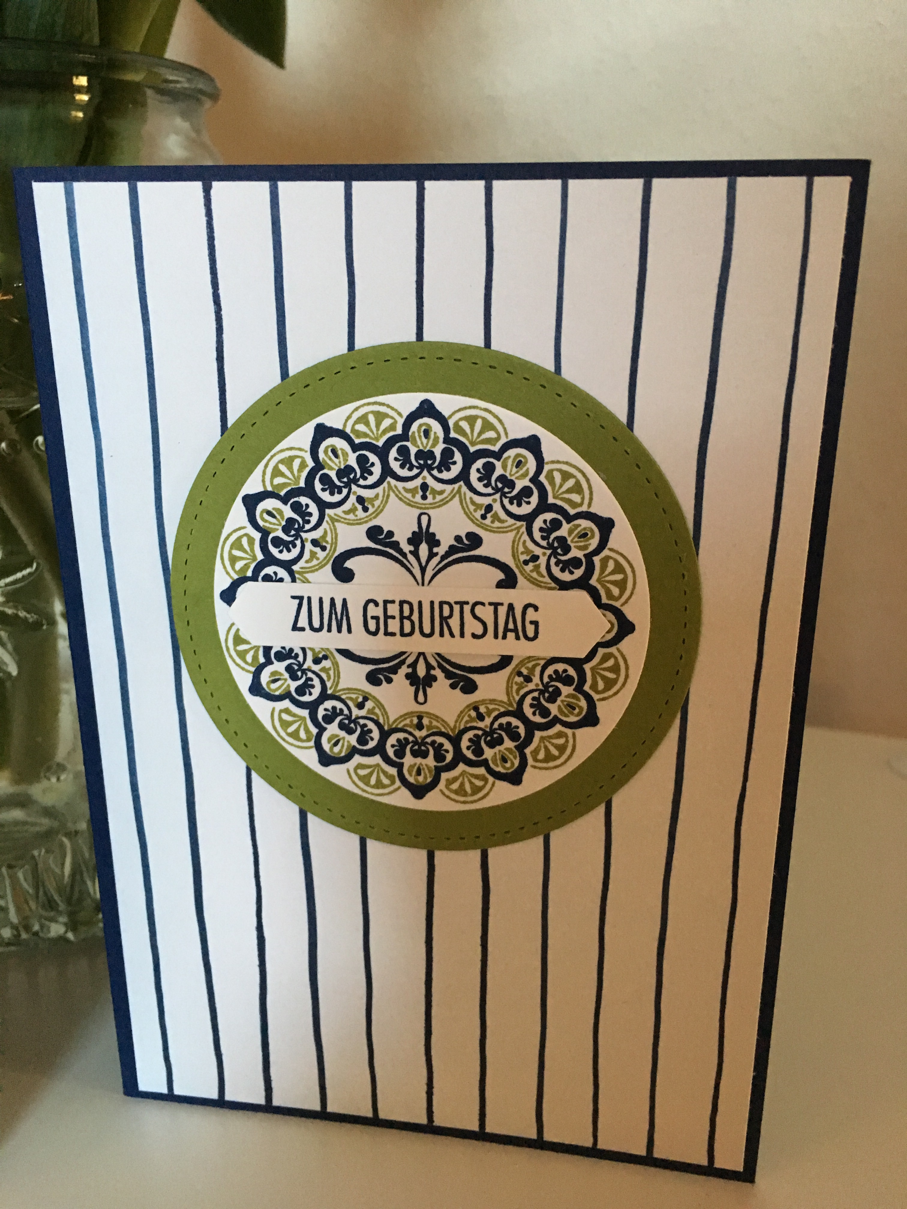Kurz vor Ende habe ich dann auch noch mal ein neues Stempelset „Mein Medaillon“ ausprobiert. In Olivgrün und Marineblau hat man einen schönen Kontrast. Als Hintergrund fungiert das DP „Blumenboutique“. Erst habe ich mich ja sehr gegen das Medaillon gewehrt, aber ich finde es mittlerweile total schön! Ein must-have. Ein kleiner Tipp: damit das Positionieren einwandfrei funktioniert, habe ich den Stampa-a-ma-jig benutzt!