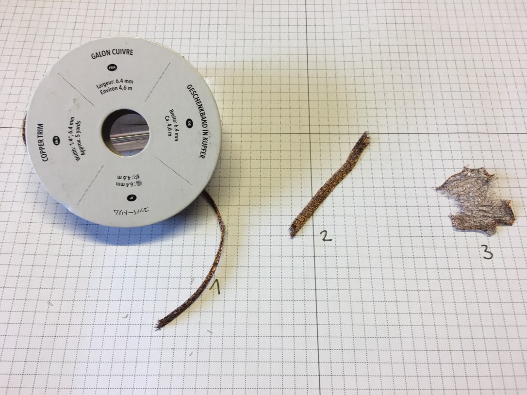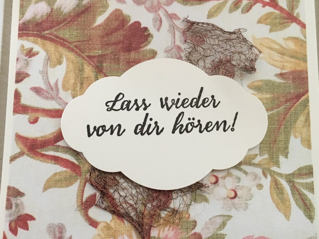 Euer Augenmerk möchte ich auf die kleine kupferfarbene Schleife unter dem Gruß „Lass wieder von dir hören“ lenken! Hier seht ihr das neue Band in kupferfarben! Wenn ihr hier ein Stückchen abschneidet und es an den Seiten auseinander zieht, erhaltet ihr dieses leicht glänzende Netz! Im Bild untern habe ich euch noch mal die Schritte demonstriert!