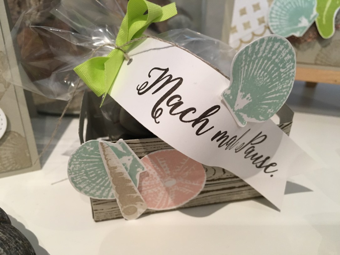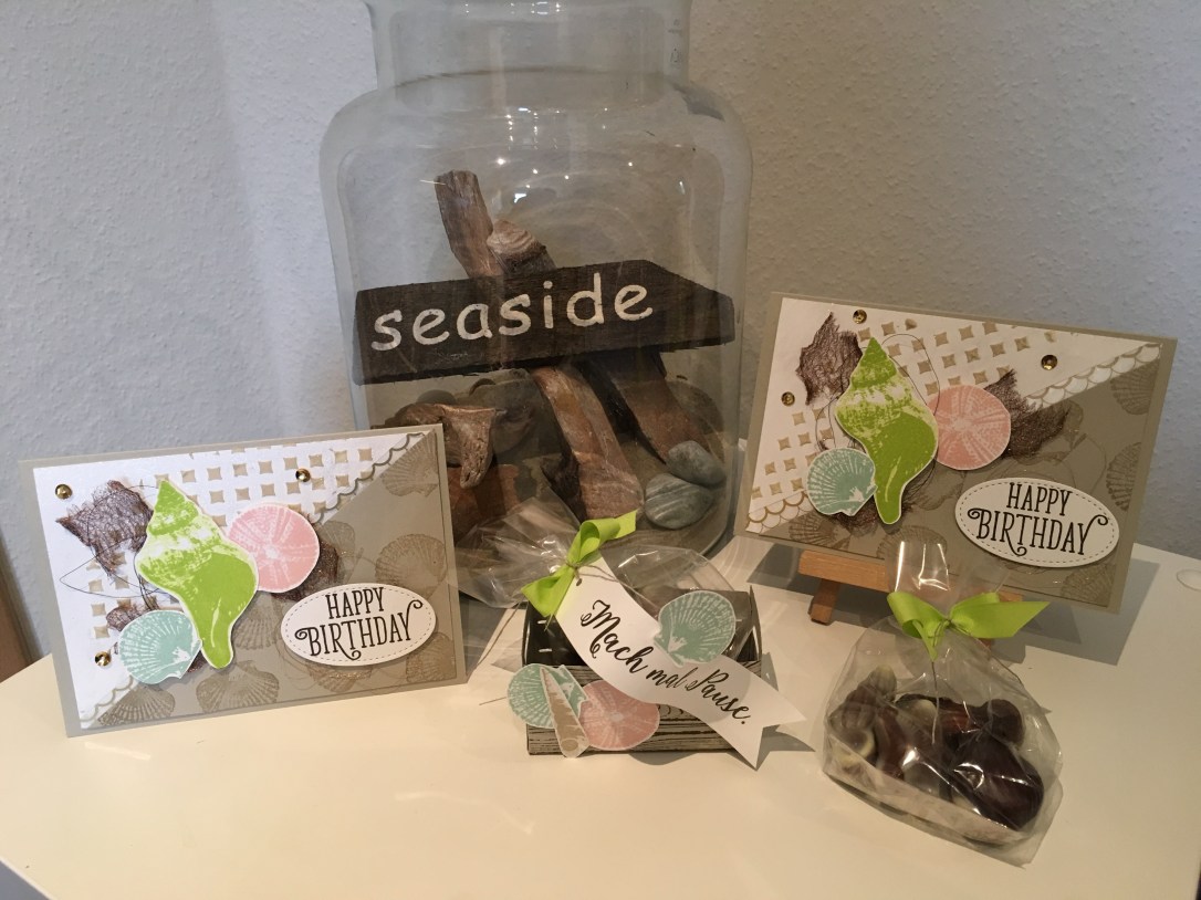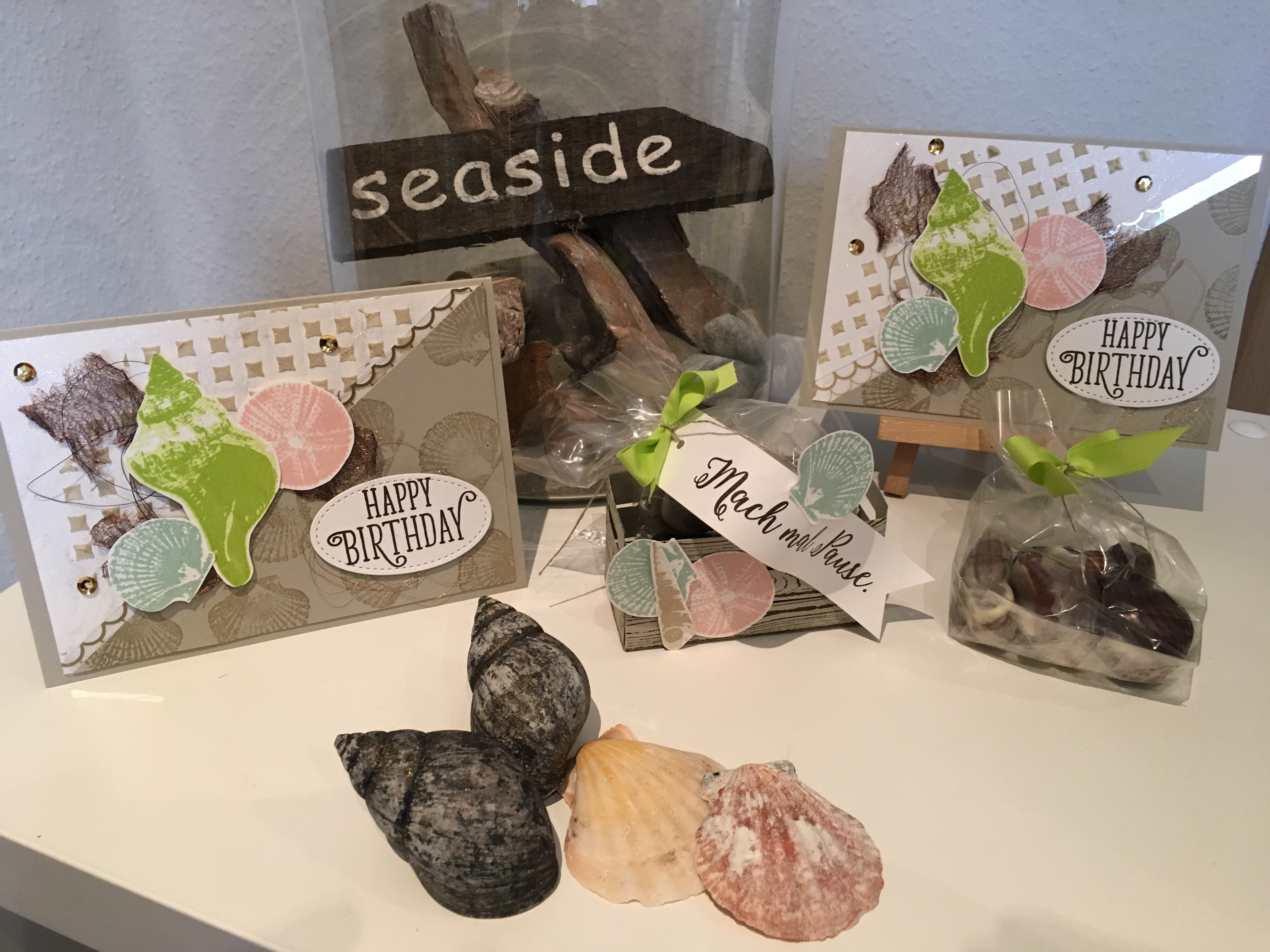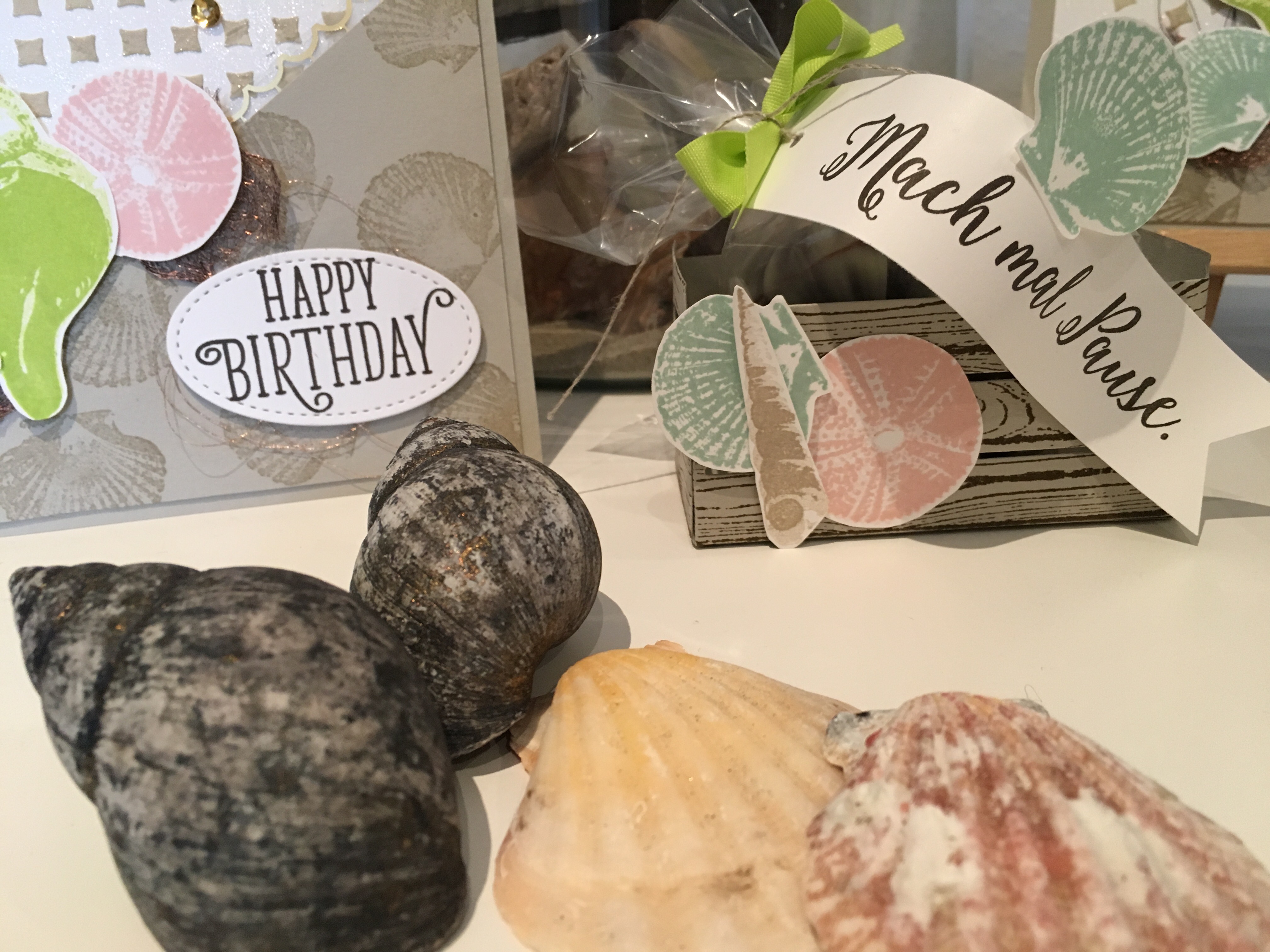 Mein zweites Projekt, das ich euch vorstellen möchte, ist eine kleine Schokoverpackung, die mit den Framelits „Holzkiste“ gestaltet wurde. Die Grundfarbe ist auch hier Saharasand. Entsprechend dem maritimen Thema habe ich als Süßigkeit belgische Pralinen in Muschel- und Seesternoptik verwendet. Der Spruch „Mach mal Pause“ stammt aus dem Set „Jahr voller Farben“. Noch schnell dekoriert mit ausgeschnittenen Muscheln ist auch dieses Projekt ganz schnell selbst gemacht.