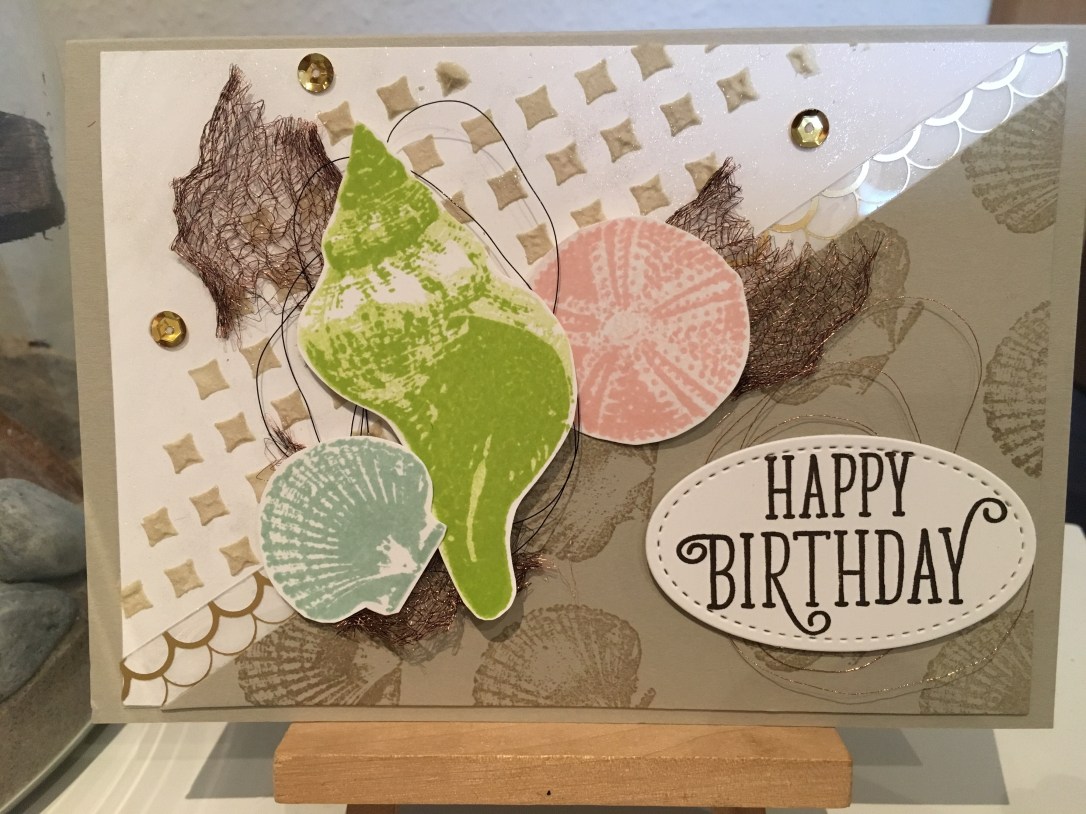 Wie es sich für eine richtige „Stempelinsel“ gehört, stelle ich euch hier das neue maritime Stempelset „So Many Shells“ vor. Ihr findet es auf Seite 38. Bei der Karte habe ich die Muscheln in den neuen InColor-Farben Limette und Puderrosa, ergänzt durch Aquamarin gestempelt.