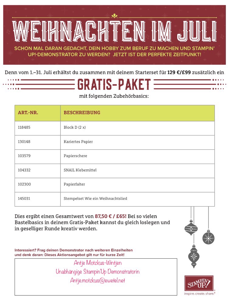 Zwischen dem 1. und dem 31. Juli bekommt jeder Neueinsteiger ein Geschenkpaket mit Basisprodukten (im Wert von 63,50 €) sowie das Stempelset Wie ein Weihnachtslied (im Wert von 24 €) gratis zum regulären Starterset dazu! Das bedeutet, dass Neueinsteiger im Juli Produkte und Geschäftsmaterialien im Wert von sage und schreibe 262,50 € für lediglich 129 € bekommen! Na, wenn das keine schöne Bescherung ist! Hier eine Übersicht der Produkte, die ihr zusätzlich erhaltet: