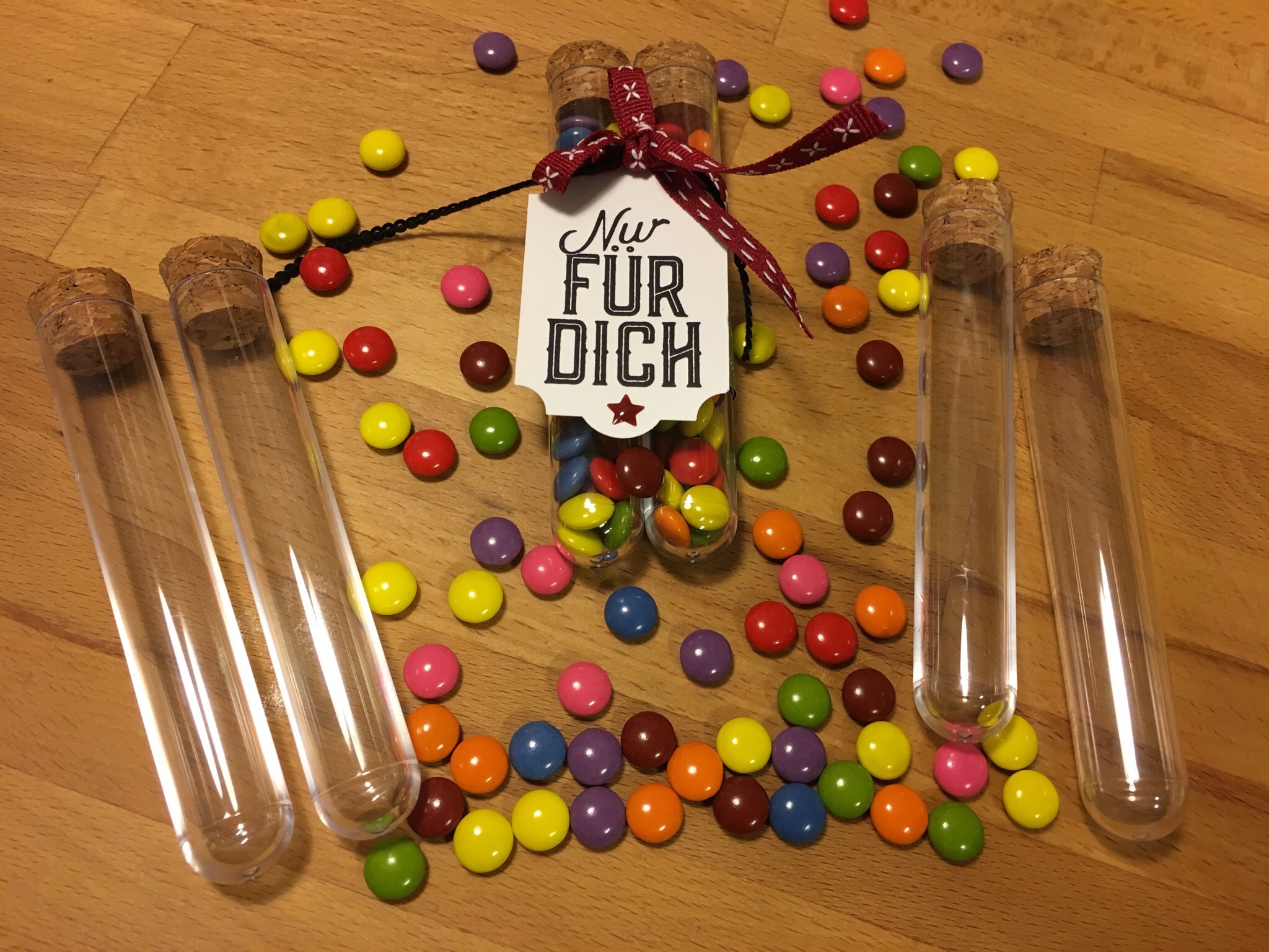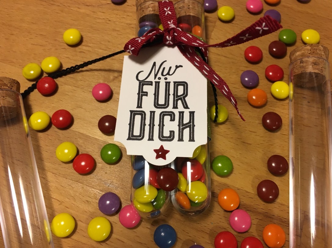 Ich habe sie hier mit kleinen Schokolinsen gefüllt! Umwickelt habe ich die beiden Röhrchen mit einen Streifen vom Designerpapier „Frohes Fest“. Das ganze aufgepeppt mit einer netten Spruch aus dem Set Weihnachtliche Etiketten, etwas Schleifenband – schon ist ein kleines Geschenk fertig!