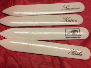 Ich habe die Falzbeile mit den entsprechenden Namen gravieren lassen! Unverwechselbar!