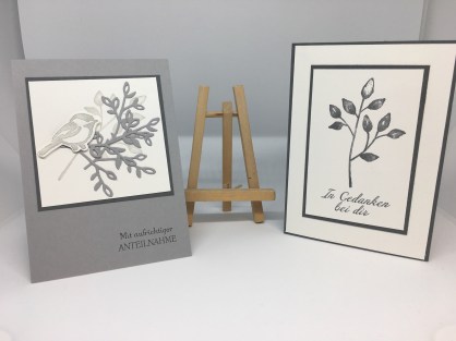 Bei den Sprüchestempeln habe ich auf Produkte aus dem Jahreskatalog zurück gegriffen: zum Einen das Set “ In Gedanken bei dir“ zum Anderen kam ein Spruch aus dem Set „Doppelt gemoppelt“ zum Zuge. Auch aus dem Sale-a-bration- Set „Blumen von Herzen“, das ihr gleich am Anfang eurer Sale-a-bration-Broschüre findet, habe ich einen Stempel benutzt. Aus eigener Erfahrung finde ich, dass am besten nur ein kleiner Spruch auf einer Trauerkarte sein sollte. Ich hoffe, die Karten gefallen euch, trotz des traurigen Themas trotzdem.