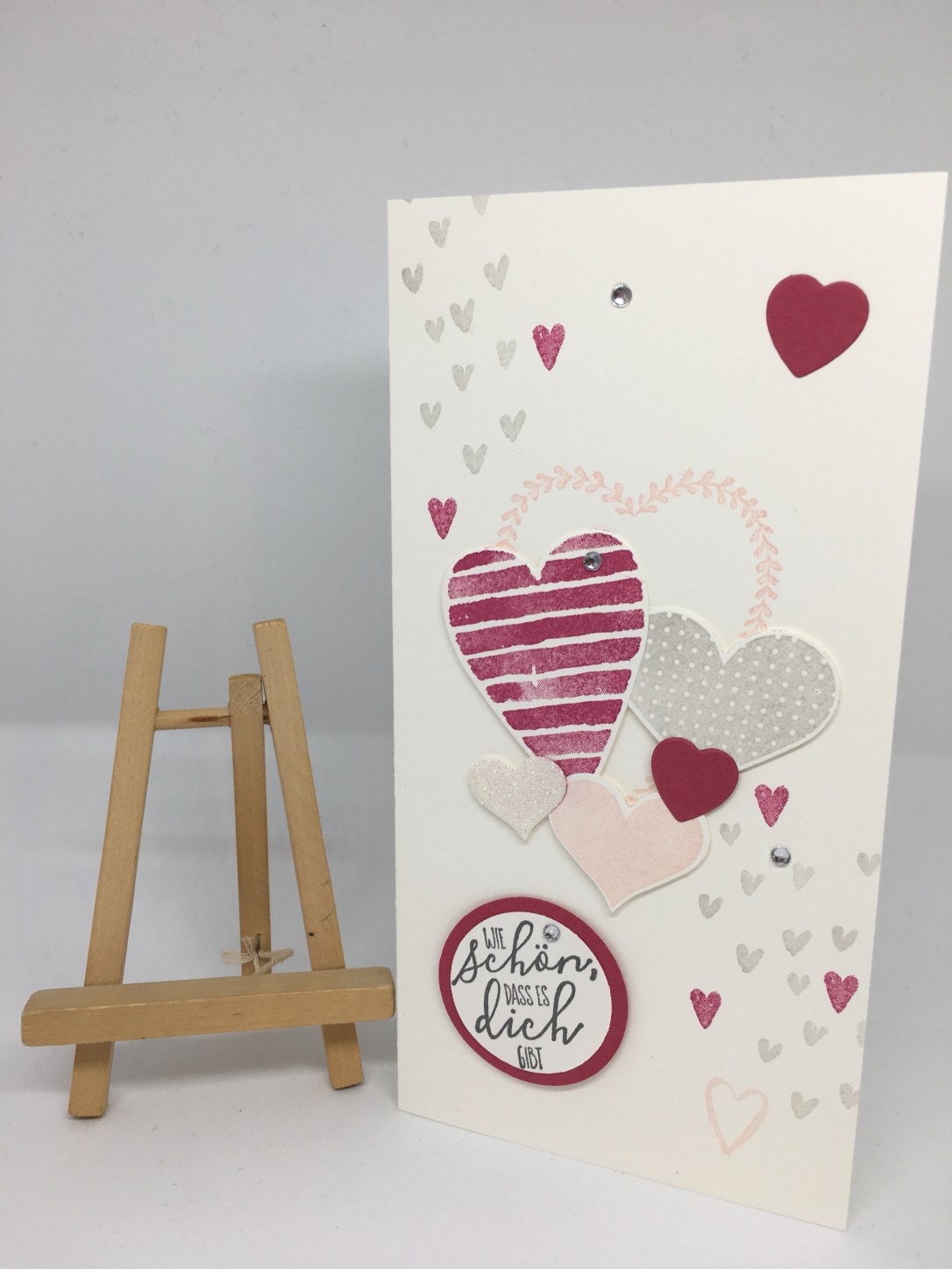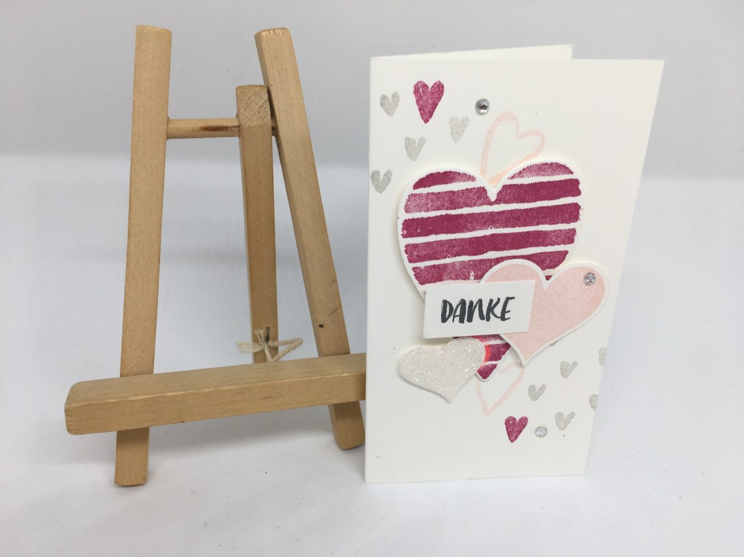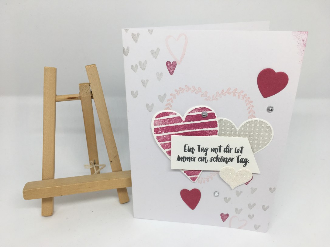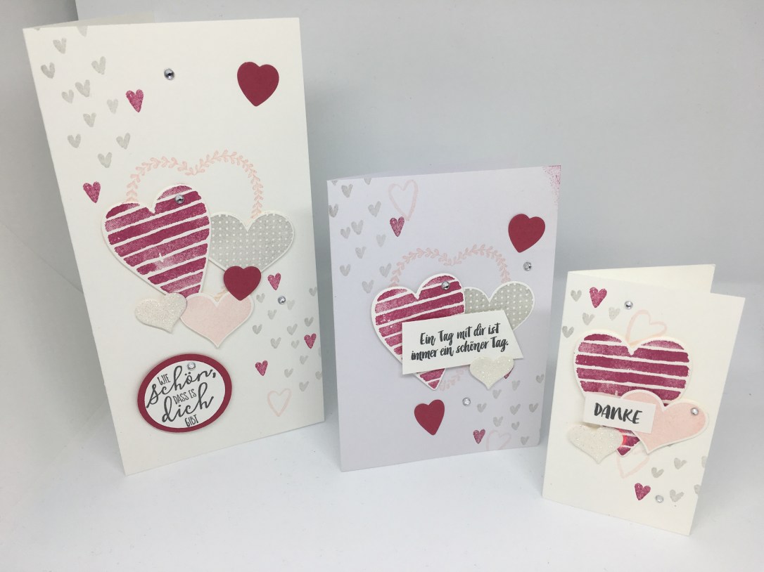 Alle Karten habe ich ähnlich aufgebaut, je nach Größe aber mit der Anzahl der Herzen und dem Spruch variiert. Verwendet habe ich wieder – es ist ja Set des Monats – die Stempelsets „Heart Happiness“ und „Für Schatz-Karten“.