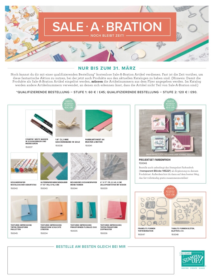 Der nächste Endpurt der ansteht ist das Auslaufen der beiden zur Zeit gültigen Kataloge! Sichere dir noch jetzt die Produkte, die es vielleicht bald nocht mehr gibt. Genaueres erfahren wir Demonstratoren ab dem 7.4.2018, aber dann geht es erfahrungsgemäß sehr schnell und einzelne Produkte sind innerhalb von Minuten ausverkauft! Bestelle also jetzt, was du noch unbedingt haben möchtest! Z.B. die INCOLOR 2016-18 und profitiere noch von den Sale-a-bration!