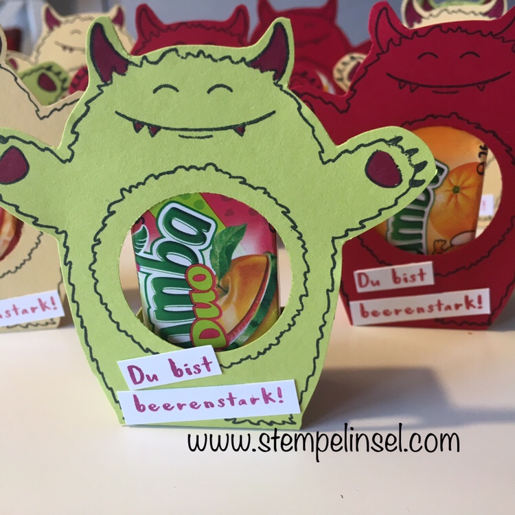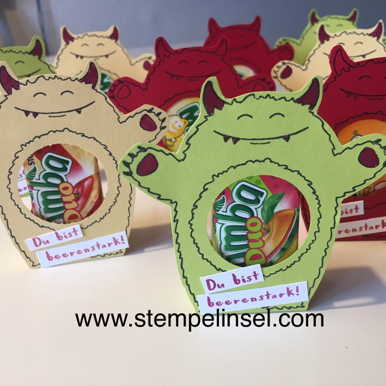 Ich habe hier wieder mal alt & neu kombiniert! Für einen Frühlingsbasar in drei Wochen habe ich hier Kaubonbons mit dem Monster von „yummi in my tummy““ aus dem Frühlingskatalog 2017 verpackt!