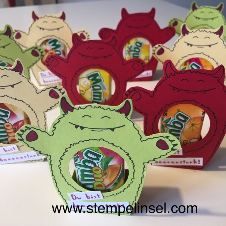 Ich habe hier wieder mal alt & neu kombiniert! Für einen Frühlingsbasar in drei Wochen habe ich hier Kaubonbons mit dem Monster von „yummi in my tummy““ aus dem Frühlingskatalog 2017 verpackt!
