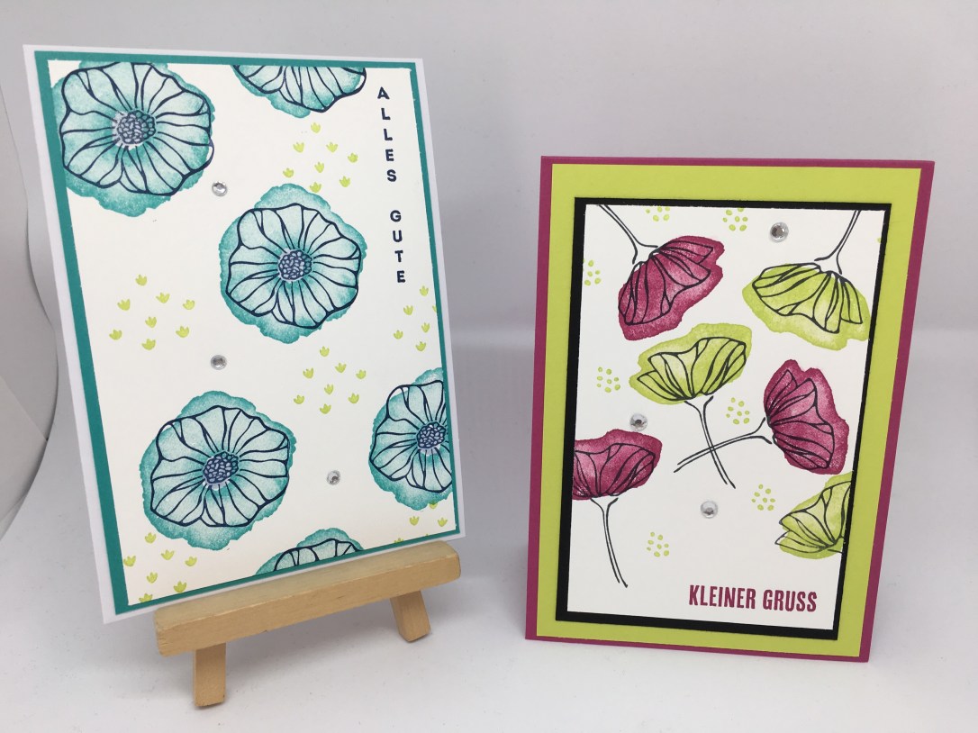 Die beiden Karten, die ihr hier seht, sind einmal in Sommerbeere (wie könnte es auch anders sein) kombiniert mit Limette und einmal in Bermudablau mit Farngrün kombiniert. Außerdem habe ich noch das Stempelset „Genial Vertikal“ (S. 50 im Jahreskatalog) benutzt.