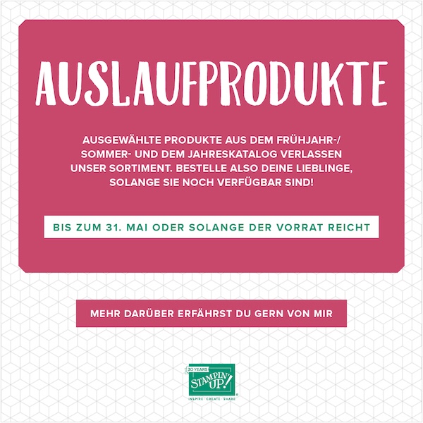 Dort sind die Auslaufprodukte (Last Chance Products) sortiert nach Stempeln (retiring stamps), Produktpaketen (retiring bundles) und sonstigen Produkten (everything else). Artikel, die nicht mehr erhältlich sind, werden dort nicht mehr angezeigt.