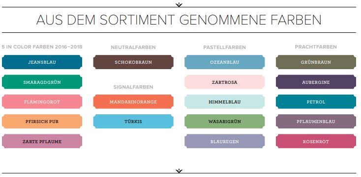 Mit dem neuen Jahreskatalog gibt es nicht nur fünf neue INcOLOR-Farben, sondern auch ein neues bzw. aufgefrischtes Farbsortiment. Das heißt es werden folgende Farben das Sortiment verlassen:
