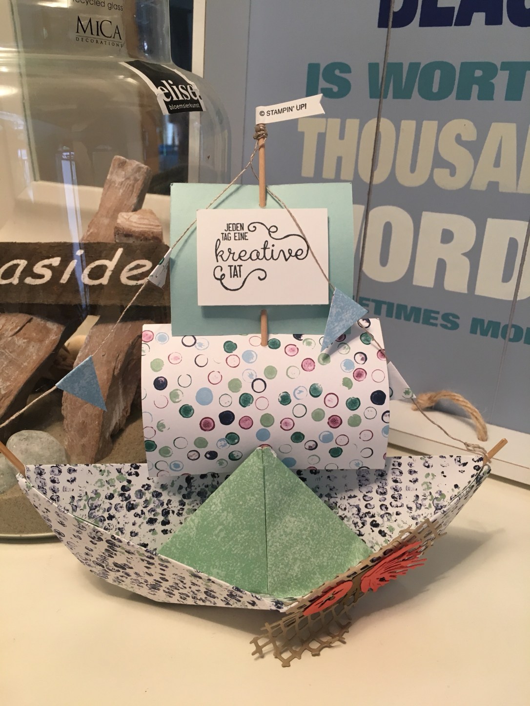 Dass man mit dem Designerpapier auc ganz konventionell basteln kann, so wie früher, seht ihr bei dem Schiff. Einfach gefaltet, wie ein Faltboot aus unserer Kindheit.