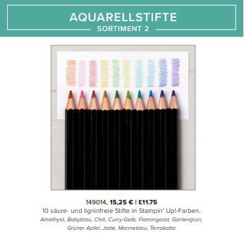 Als Ergänzung unserer bereits erhältlichen Aquarellstifte gibt es im Angebotszeitraum ein weiteres Sortiment Aquarellstifte mit neuen Farben. Stampin’ Up! behält sich vor, die Aquarellstifte auch über den August hinweg weiter zu vertreiben, aber sicher ist es nicht.