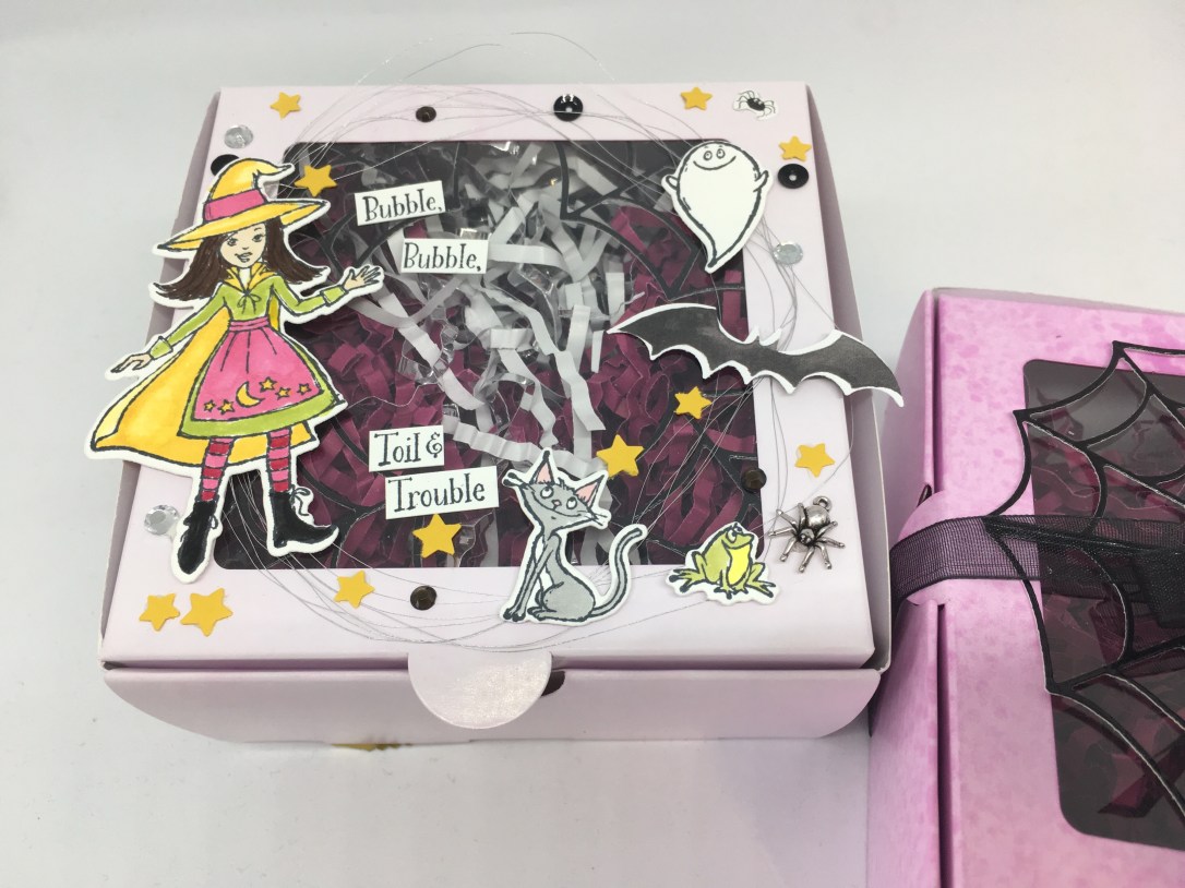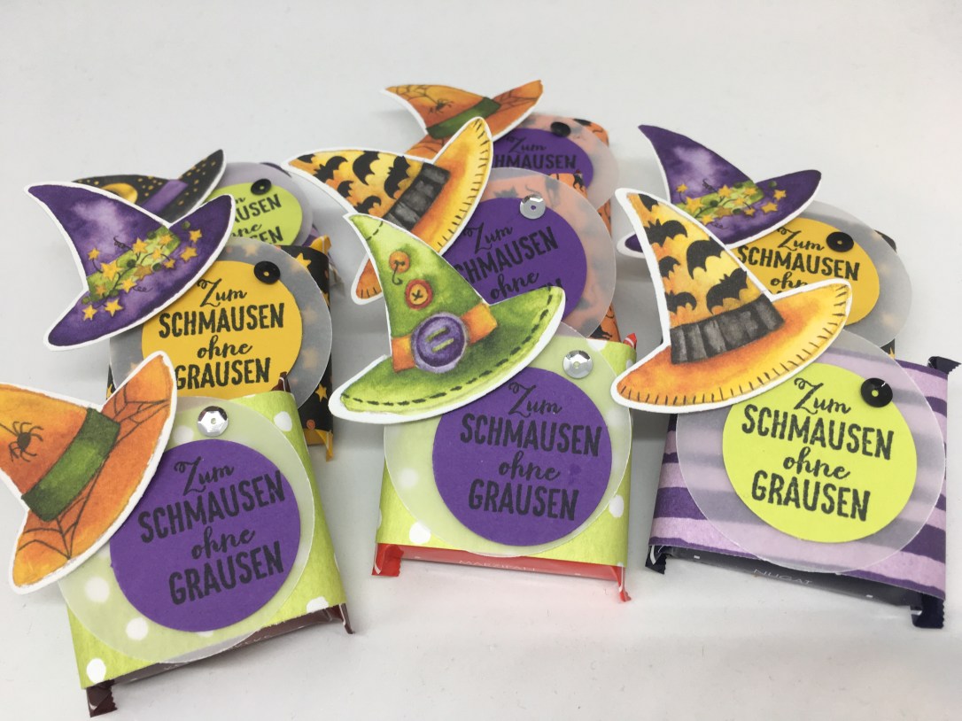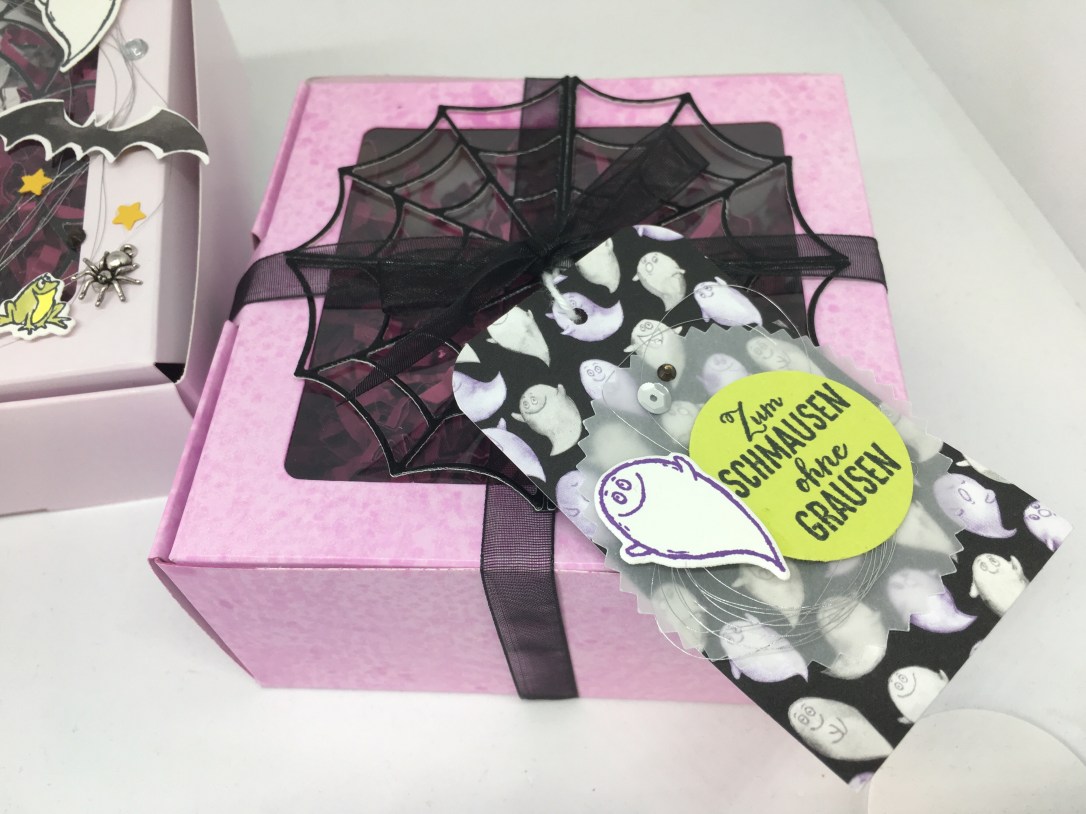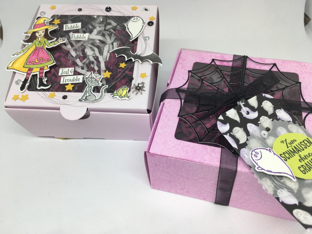 Ich habe allerdings nicht mit dem weihnachtlichen Basteln begonnen – dazu ist mir noch zu sommerlich, aber hier und da gibt es ja schon ein paar herbstliche Momente, so dass ich mich mit dem neuen Produktset „Wie verhext“ beschäftigt habe. Entstanden sind einige Goodies und eine schöne Schachtel, ideal zum Verschenken.