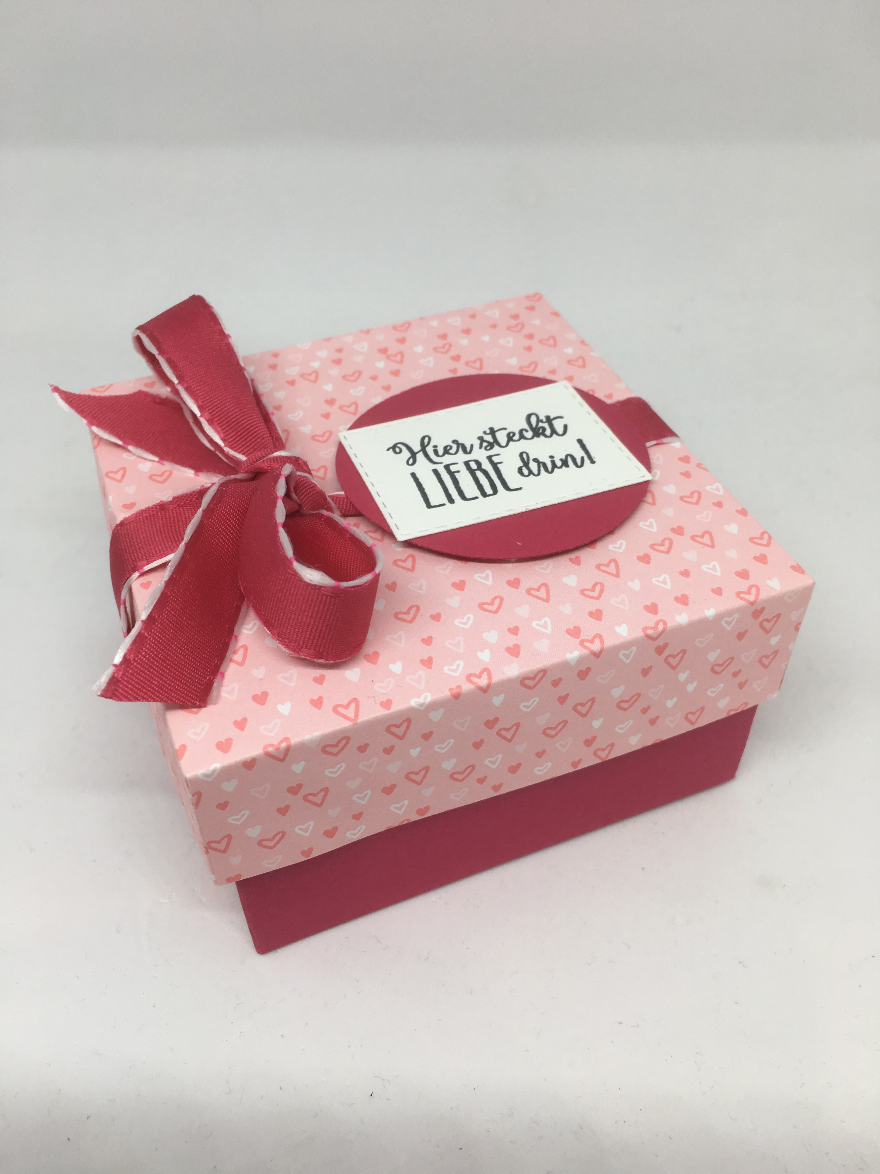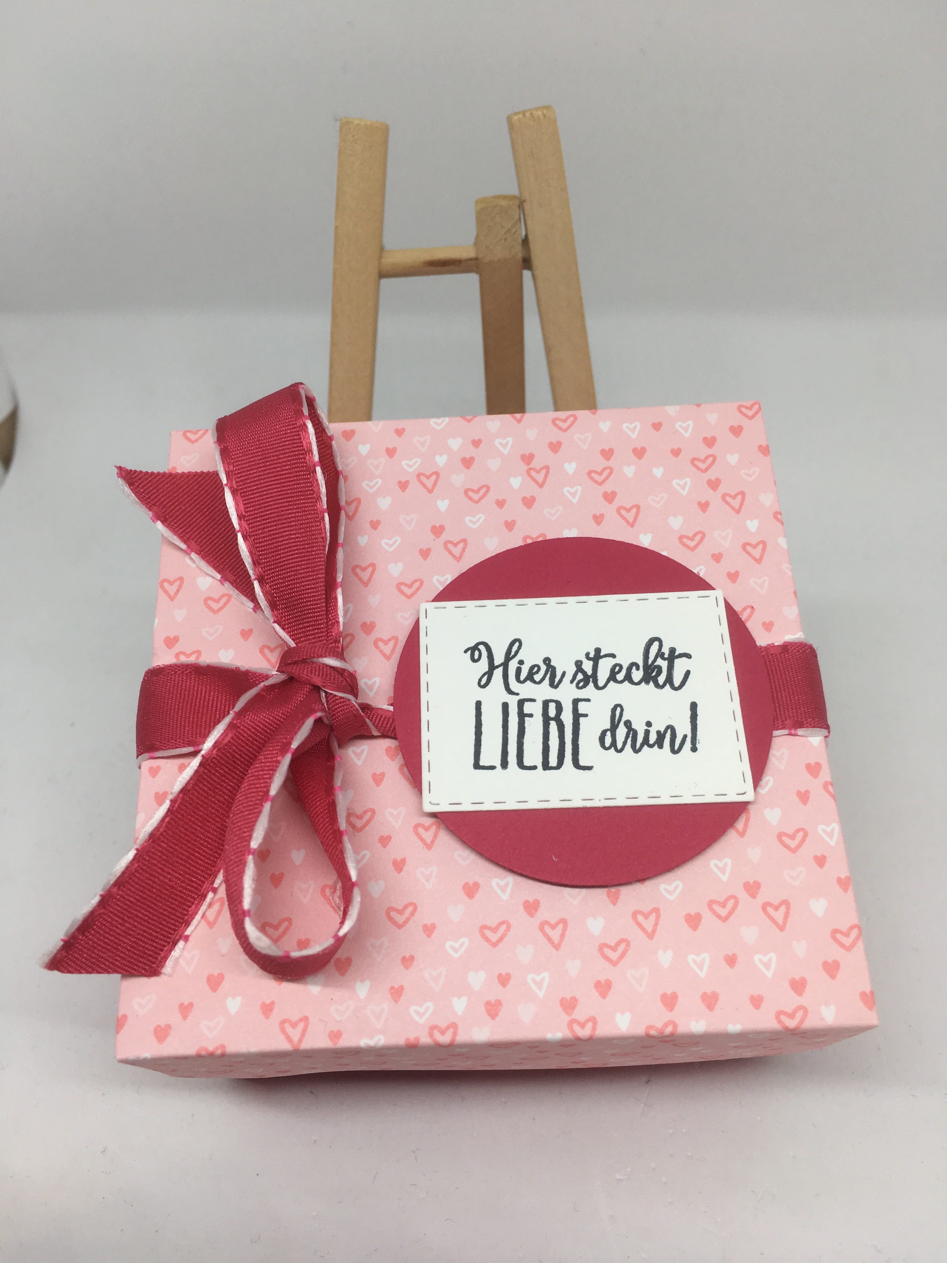 Bei der Schachtel habe ich auch wieder das Designerpapier aus der Reihe „In Liebe“ benutzt, kombiniert mit dem kussroten Farbkarton. Die passende Schleife rundet das Bild ab. Der Stempel stammt aus dem Sale-a-Bration Set „Süße Grüße für dich“, das ihr ab einem Einkauf von 60€ GRATIS erhaltet.