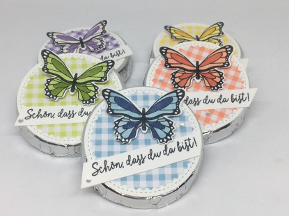 Heute zeige ich euch schnell noch ein paar Schmetterlinge…. solange es sie noch gibt. Letzte Woche habe ich euch ja gezeigt, wie einfach mit diesem Set die kleinen Flattermänner zu gestalten sind. Jetzt mussten die beiden ja verarbeitet werden. Ich habe vor ein paar Jahren schon einmal die lilafarbenen Schokoladentaler eines namenhaften Herstellers mit unseren entzückenden Libellen verziert. Jetzt habe ich es einmal mit den Schmetterlingen versucht.