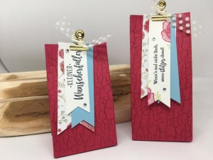 Als Farbe bei den Tüten habe ich Kussrot – eine Incolor- Farbe 2018-2020- gewählt und Ton-in-Ton mit dem neuen Hintergrund-Stempel „Crackle-Paint“ bestempelt.