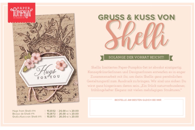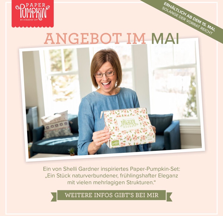 Im Mai, ab dem 15.05., wird es auch in Deutschland ein einmaliges limitiertes Paper Pumpkin Kreativset geben (solange der Vorrat reicht), mitentworfen von der Stampin‘ Up! Gründerin Shelli Gardner.