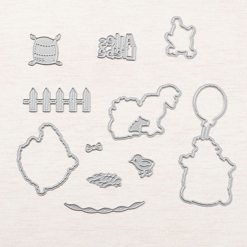 Zusammen mit dem Paket Hu(h)ndert gute Wünsche aus dem Minikatalog könnt ihr tolle Sachen – auch schon im Hinblick auf Ostern gestalten. Im Gepäck passende Stanzformen für die Stanzmaschinen. Im Set erhaltet Ihr die Produkte 10% günstiger.