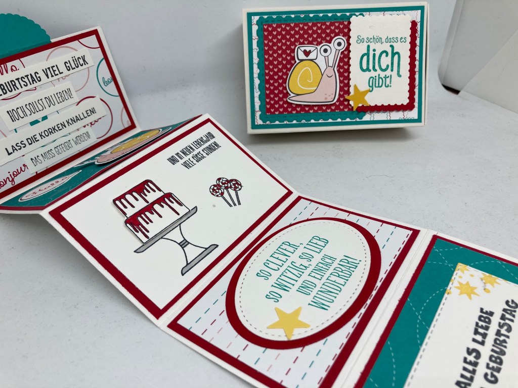 Die Basis bildet die Leckereien-Schachtel für Immer im Herzen (Best.: 154285); hierin habe ich ddas eigentliche Leporello eingebettet. Alles verzier mit der Schneckenpost und natürlich noch anderen schönen Sprüchen passend zum Geburtstag. Wie es geht, seht ihr hier in meinem neuen Video!