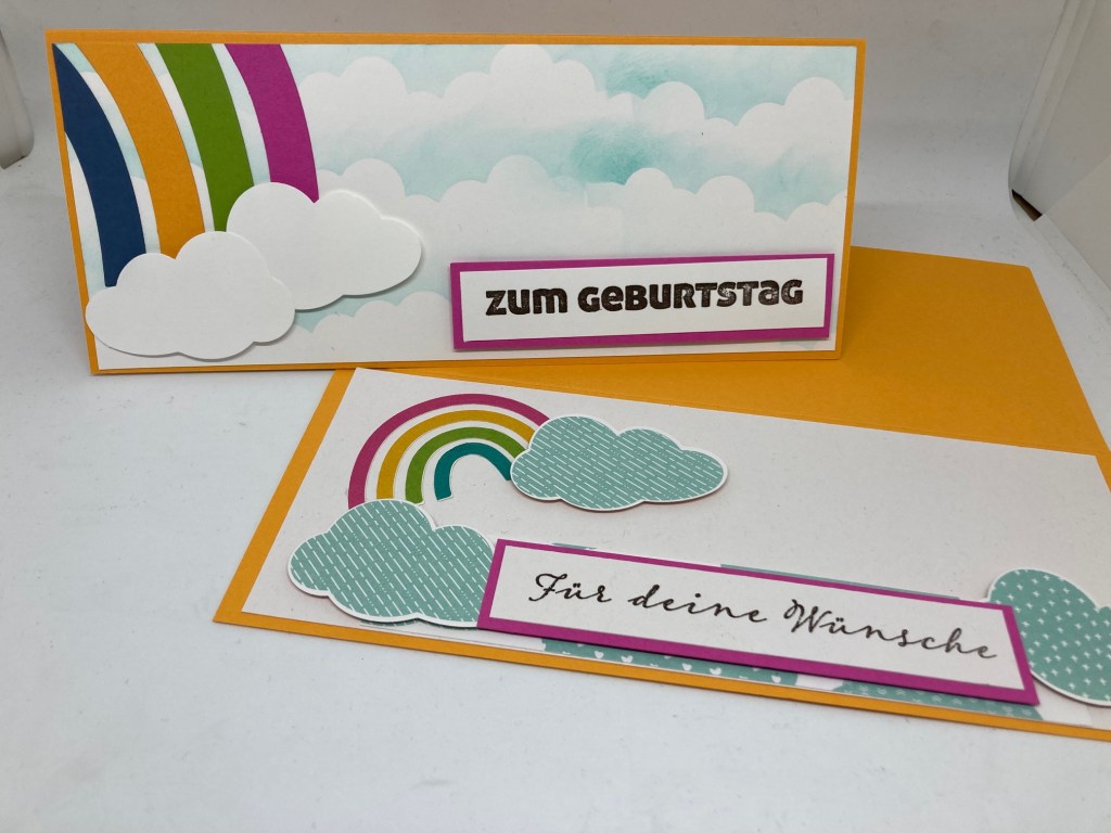 it dem neuen Minikatalog für den Frühling 2022 gibt es die eine neue Produktreihe Farbenfrohe Freude und damit die Möglichkeit nicht nur Regenbögen zu zaubern. Wie ihr die passenden Wolkenhintergründe gestaltet, zeige ich euch hier im Video mit zwei verschiedenen Möglichkeiten!