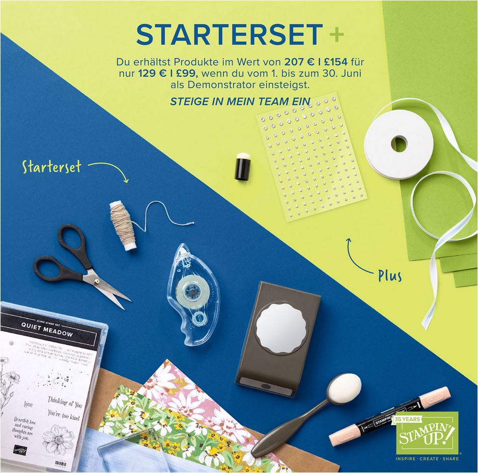 Jetzt lohnt es sich besonders, bei Stampin’ Up! einzusteigen! Denn als neues Teammitglied kannst du dich auf noch mehr GRATISPRODUKTE im variablen Starterset freuen: Vom 1. bis 30. Juni erhalten alle, die einsteigen, Produkte im Wert von 207 € für nur 129 € – dazu kostenlose Geschäftsmaterialien, Gratisversand und jede Menge Spaß als Teil der Stampin’ Up!-Familie! Ich würde mich freuen, wenn du Mitglied im Team Stempelinsel wirst! [du bist als Demo nicht verpflichtet, Stempelpartys o.ä. zu m,achen. Wenn du keine Lust mehr hast, hörst du einfach auf! Alles in allem erhältst du deine Stampin’UP!-Produkte um 20-25 günstiger, als wenn du als Kund*in bestellst.] Alle Infos dazu findest du auch hier [klick] . Melde dich gerne bei mir, wenn du noch Fragen hast!