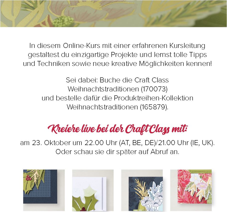 Es gibt drei neue Kreativsets – hier geht es zum LINK. Und die erste Stampin’UP! Craft Class findet statt.